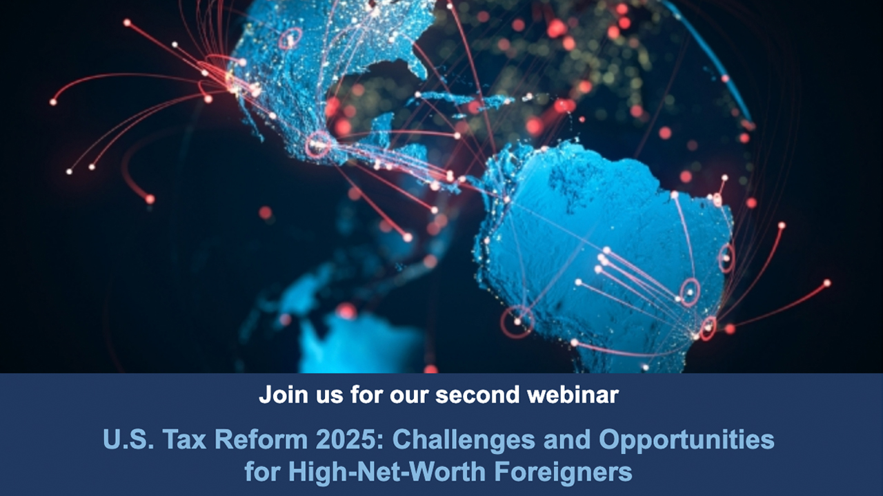 We invite you to join us for a free webinar, in Spanish, on the challenges and opportunities for U.S. tax planning for high-net-worth foreigners. Attorneys Liliana Menzie, Lea G. Udler and Juan Pablo G. Zaragoza will discuss certain changes to estate planning laws resulting from the 2025 U.S. tax reforms, including an overview of trusts, the estate tax, the gift tax and various related issues, which are critical for foreigners with assets in the U.S. and for foreigners with family members who are U.S. citizens or residents.